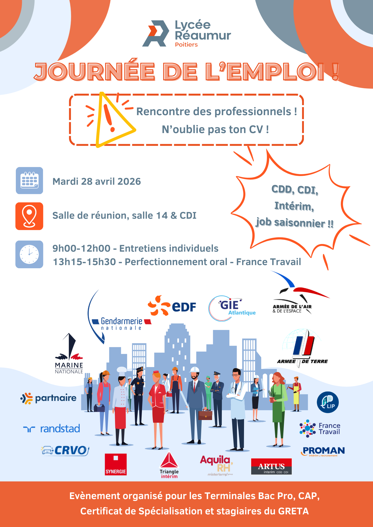 Le mardi 28 avril, notre établissement organise une journée de l’emploi dédiée à la rencontre entre nos élèves et des professionnels. À cette occasion, plusieurs acteurs du monde du travail seront présents : Agences d’intérim, Armées, France Travail, EDF, GIE …